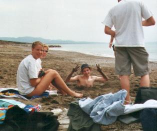 Nando im Sand eingebuddelt (links Lene und Manu)